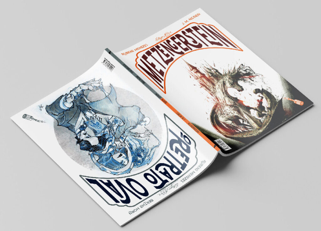 As duas HQs têm roteiro e edição de Rubens Menezes. De um lado, O Retrato Oval, com os traços oníricos e febris de Bertho Horn. Do outro, Metzengerstein, o primeiro conto publicado por Poe, reimaginado pelo lendário desenhista J. M. Nicolosi, mestre do desenho de movimento e do desenho de cavalos, num traço leve e luminoso que contrasta e dialoga com a sombria densidade de O Retrato Oval. Cada desenhista reinterpretou o conto e o estilo do outro, num gesto de troca e homenagem, criando a capa da história do companheiro.